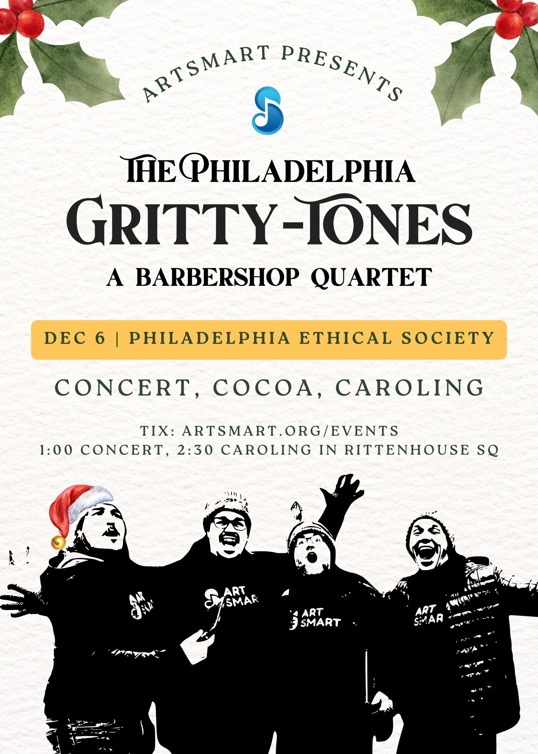 Join ArtSmart for a one-of-a-kind benefit concert featuring The Philadelphia Gritty-Tones, a barbershop holiday quartet made up of four top-tier Philly musicians who harmonize harder than the Eagles’ defensive line and sport more team pride than Broad Street after a championship win.